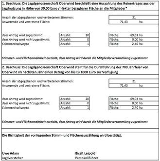 Die Auszahlung des Ertrages aus der Jagdnutzung an die Jagdgenossen nach dem Verhältnis des Flächeninhaltes ihrer beteiligten Grundstücke erfolgt auf der Grundlage eines schriftlichen Antrages mit Flächennachweis. Die zu verwendenden Antragsformulare sind beim Jagdvorsteher Uwe Adam, Oberwind, Brattendorfer Str. 11, 98673 Auengrund erhältlich. Die Auszahlungsanträge müssen bis spätestens 31. Januar 2024 beim Jagdvorsteher eingegangen sein (Ausschlußfrist). Später eingereichte Auszahlungsanträge werden nicht berücksichtigt!