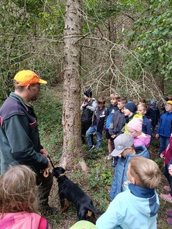 Die Kinder hören gespannt dem Förster zu.