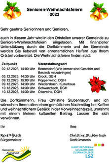 auch in diesem Jahr wird in den Ortsteilen unserer Gemeinde zu Senioren-Weihnachtsfeiern eingeladen. Mit finanzieller Unterstützung durch die Dorfkümmerin und der Gemeinde werden sie liebevoll von ehrenamtlichen Helfern aus Ihrem Ortsteil vorbereitet. Die Weihnachtsfeiern finden statt: