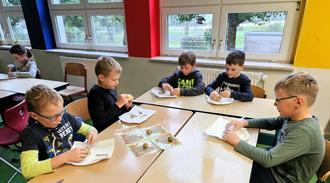 Mit großem Appetit verspeisten die Schüler die aus dem eigenen Schulgarten geernteten Erdäpfel mit leckerem Kräuterquark.