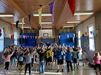 In der ersten und zweiten Stunde konnten die dritte und vierte Klasse gemeinsam mit Herrn Hirschel Tänze üben und einstudieren. In den folgenden zwei Stunden waren die erste und die zweiten Klassen an der Reihe. Schritt für Schritt zeigte Herr Hirschel die Tanzschritte. Alle Kinder übten mit Begeisterung.