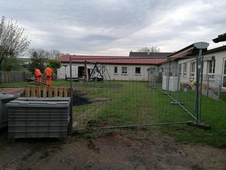 Mitarbeiter des Bauhofes rückten im Mai mit dem Bagger an und führten Erd- und Gründungsarbeiten für die neue Spielkombination aus. Es folgte die Herstellung der Fundamente und nach dem Aushärten dieser wurde das Spielgerät montiert. Für die Wippe wurde ein neuer Platz gefunden, der mit allen anderen Spielgeräten mit Fallschutz ausgestattet wurde. Von den Fenstern aus haben die Kinder das Baugeschehen und den Baufortschritt genau verfolgen können.