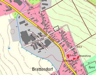 Lageplan mit Geltungsbereich (schwarz gestrichelt) der Ergänzungssatzung „Siedlungsstraße“ - Gemeinde Auengrund / OT Brattendorf (Kartengrundlage: WEBAtlasDE „Geoproxy Thüringen“; ohne Maßstab)