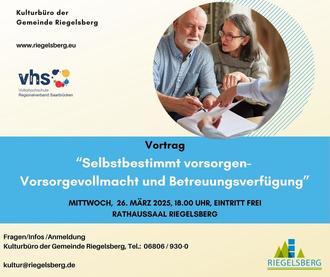 Die Gemeinde Riegelsberg lädt zu einem interessanten Vortrag zu dem Thema „Selbstbestimmt vorsorgen – Vorsorgevollmacht und Betreuungsverfügung“ mit Frau Natascha Bauer, Mitarbeiterin der Betreuungsbehörde des Regionalverbandes am