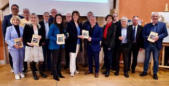 Im Beisein aller Autorinnen und Autoren übergibt Redaktionsleiterin Monika Jungfleisch das neue Köllertaler Jahrbuch an den Heusweiler Bürgermeister Thomas Redelberger, seine Kollegin Denise Klein aus Püttlingen (l.) und seinen Kollegen Klaus Häusle aus Riegelsberg (r.), an die Regionalverbandsdirektorin Dr. Carolin Lehberger (3.v. l.) und an die Leiterin der vhs im Regionalverband Nicole Boissier (2.v. l.).