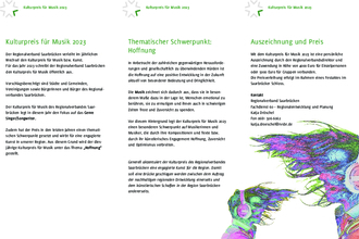 Der Regionalverband Saarbrücken verleiht 2023 erneut den Kulturpreis für Musik, der im jährlichen Wechsel mit dem Kulturpreis für Kunst vergeben wird. Voraussetzung: Die Bewerberinnen und Bewerber müssen im Regionalverband Saarbrücken wohnhaft und künstlerisch tätig sein. Unter dem Motto Hoffnung liegt in diesem Jahr der Schwerpunkt auf dem Genre Singer/Songwriter. Unsere Gesellschaft und die Politik steht aktuell vor großen Herausforderungen. Die Hoffnung auf eine positive Zukunft kann dabei besondere Energie freisetzen. Gerade die Musik zeichnet dabei aus, dass sie Menschen emotional berührt, sie ermutigt und ihnen auch in schwierigen Zeiten Trost und Zuversicht spendet. Deshalb suchen wir insbesondere Musikerinnen und Musiker, die durch ihre Kompositionen, ihre Texte und Regionalverbandsdirektor Peter Gillo. Damit wird insbesondere auf den Leitgedanken des Kulturpreises Bezug genommen, der für eine engagierte Kunst in der Region wirbt. Mit dem Kulturpreis für Musik ist eine Zuwendung in Höhe von 4.000 Euro für Einzelpersonen oder 5.000 Euro für Musikgruppen verbunden. Die Preisverleihung findet im Rahmen eines Festaktes im Saarbrücker Schloss statt. Städte und Gemeinden, Vereinigungen sowie Bürgerinnen und Bürger des Regionalverbandes Saarbrücken können Musikerinnen, Musiker sowie Musikgruppen für den Kulturpreis für Musik vorschlagen. Eigenbewerbungen sind ausgeschlossen. Eingereicht werden muss eine Kurzbiografie mit Foto sowie eine Dokumentation des bisherigen Schaffens der Vorgeschlagenen. Zudem muss die Umsetzung des Themas Die vollständigen Formalitäten sind im Internet unter www.regionalverband.de/kulturpreis abrufbar. Die Vorschläge müssen schriftlich in einer Bewerbungsmappe sowie zusätzlich in digitaler Form (CD oder USB-Stick) bis spätestens 21. August an folgende Postadresse eingereicht werden: Regionalverband Saarbrücken, Regionalentwicklung und Planung, Katja Dröschel, Schlossplatz 12, 66119 Saarbrücken. Die eingereichten Unterlagen bilden die Grundlage für die Bewertung einer Jury, die vom Regionalverband Saarbrücken berufen wird. Weitere Informationen sind telefonisch unter 0681 506-6062 oder per E-Mail an katja.droeschel@rvsbr.de erhältlich.