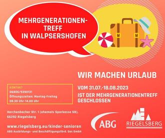 Vom 31.07.- 18.08.2023 ist der Mehrgenerationentreff geschlossen.