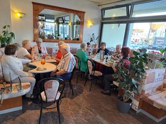 Eine Gruppe mitfahrende Personen nach dem Theaterbesuch im Eiscafe Tassemo in Riegelsberg beim gemütlichen Beisammensein