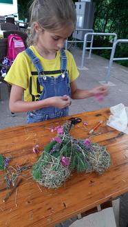 Unsere Dozentin Susanne Hübschen (Floristin) zeigt, wie man aus Zeitung, Heu und Draht eine Herzunterlage machen kann. Ausgeschmückt wird dieses Herz dann noch mit Blüten, Blättern und Kräutern aus der Natur.