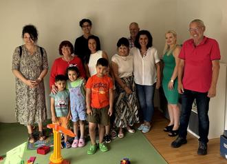 v.l.n.r. Angelika Schallenberg, Leiterin des Jugendamtes des Regionalverbandes Saarbrücken, Anita Morschette-Sarg, Beigeordnete des Regionalverbandes Saarbrücken, Christina Cazzini, Jugendamt Regionalverband, Waltraud Jäger, 1. Vorsitzende des Kinderschutzbundes OV Saarbrücken, Ortsvorsteher Werner Hund, Martina Riedel, pädagogische Geschäftsführerin des Kinderschutzbundes OV Saarbrücken und ganz rechts, Bürgermeister Klaus Häusle
