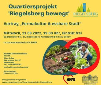 Quartiersprojekt „Riegelsberg bewegt“ lädt zusammen mit dem BUND zum Vortrag „Permakultur & essbare Stadt“ ein. Die Veranstaltung findet in Riegelsberg, Saarbrücker Straße 27, am Mittwoch, dem 21.09.2022 um 19 Uhr statt.