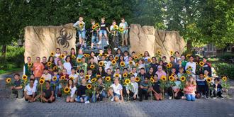 Im Anschluss daran riefen die neuen Klassenleitungsteams ihre Schüler zu sich auf die Bühne und überreichten ihnen als Willkommensgeschenk eine leuchtende Sonnenblume – ein Symbol dafür, dass die Schulgemeinschaft sich auf die neuen Schüler freut, dass diese sich an der neuen Schule gut aufgehoben fühlen und viel Freude am Lernen haben sollen. Dieses Geschenk an jedes Kind war möglich, weil der Förderverein des Albert-Einstein-Gymnasiums die Aktion regelmäßig unterstützt. Anschließend wurde auf dem Schulhof ein erstes Klassenfoto gemacht und danach ging es mit dem Unterricht am Gymnasium im neuen Klassensaal endlich los.
