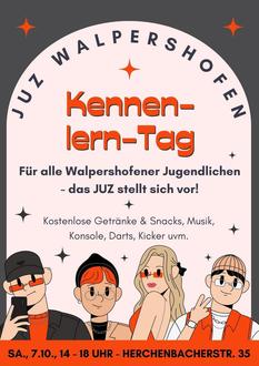 Am Samstag, den 07.10., findet von 14 bis 18 Uhr im Jugendtreff Walpershofen (Herchenbacherstr. 35) ein "Kennenlern-Tag" für alle interessierten Jugendlichen aus Walpershofen statt. Es geht um die Vorstellung des Treffs mit seinen Angeboten, Beteiligungsmöglichkeiten, die Sammlung von Ideen für kommende JUZ-Aktivitäten und Öffnungszeiten für Jüngere. Der JT Walpershofen e.V. möchte damit alle Jugendlichen erreichen, die einen Ort suchen, um sich ungezwungen mit Freunden und Gleichaltrigen zu treffen, an dessen Gestaltung sie aktiv mitwirken können. Zum "Kennenlern-Tag" stehen die üblichen Angebote des Treffs, wie Kicker, Darts, Musikanlage, Spielkonsolen usw. bereit. Zusätzlich gibt es kostenlose Snacks und Getränke für alle Besucher.