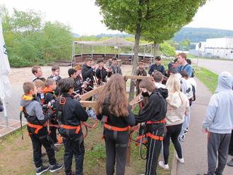 Danach erklärten uns die Mitarbeiter an einem Übungsparcour wie man sich sichert und was es alles beim Klettern zu beachten gibt. Als wir dies verstanden hatten, ging es auch schon los. Wir durften zuerst die beiden Kletterparcours machen, die nicht so hoch waren, um zu üben und damit wir das Sichern mit den Haken ausprobieren konnten. Danach konnte jeder aussuchen, auf welchen Strecken er/sie klettern wollte. Es gab 10 verschiedene Kletterparcours zur Auswahl. Einige haben sich sogar auf die hohen Strecken getraut. Zwischendurch musste immer wieder der eine oder andere von einem Mitarbeiter gerettet werden - da man zum Beispiel bei der Seilrutsche nicht genug Schwung hatte und in der Mitte des Seiles hing. Es machte uns allen sehr viel Spaß, aber es war teilweise auch sehr anstrengend. Deshalb konnten wir zwischendurch auch eine Pause machen und etwas essen und trinken.