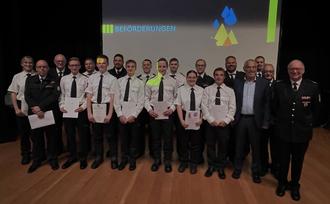 Vom Oberfeuerwehrmann zum Löschmeister wurden Nikolas Arnold, Oliver Mayer und Tobias Schmidt (alle LB 1) sowie Sascha Wald vom LB 2 befördert.