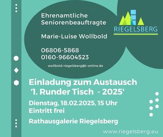 Die ehrenamtliche Seniorenbeauftragte, Frau Marie Luise Wollbold und das Kulturbüro der Gemeinde Riegelsberg, laden alle interessierten Bürgerinnen und Bürger zum ersten „Runden Tisch 2025“ herzlich ein.