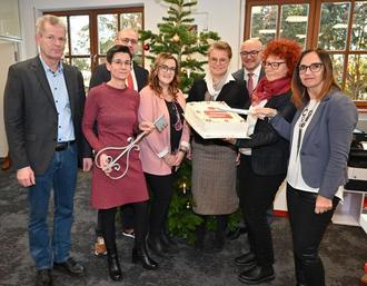 Schlüsselübergabe und Tortenanschnitt (von links): Bürgermeister Ronny Römhild, Privatkundenberaterin Kathrin Brenn, Filialleiter Torsten Engelhaupt, Servicekundenberaterin Vanessa Kleffel, Vorstandsvorsitzende Annette Theil-Deininger, Vorstandsmitglied Kay Gehri, Mitarbeiterin SAB Kommunikation Kerstin Jülich, Privatkundenberaterin Nicole Kuhn