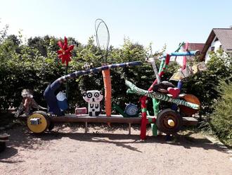 Das Schwemmholz und weiterer Müll des Werrahochwassers im Februar 2024 inspirierte die Jugendlichen, dies zu recyceln und etwas Kreatives damit zu gestalten. Nach gemeinsamer Beratung und Planung, beantragten sie Fördergelder über das Bundesprogramm „Demokratie Leben“. Mit diesen Mitteln konnten weiter Materialkosten sowie der Dozent finanziert werden. Nachdem der Bauhof die Voraussetzungen für die standsichere Befestigung geschaffen hatte, begann noch vor den Sommerferien der Bau vor dem Jugendclub. An der Erstellung der Skulptur beteiligten sich zirka zwanzig Kinder und Jugendliche im Alter zwischen 8 und 17 Jahren, welche durch Jörg Wagner von der Kunststation Oepfershausen angeleitet wurden. Die Zusammenarbeit zwischen den Teilnehmern unterschiedlichen Alters lief hervorragend und alle hatten viel Spaß an der Umsetzung ihrer Ideen.