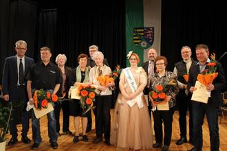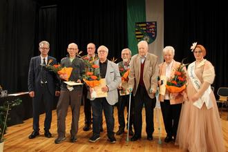 Die Ehrenmedaille der Gemeinde Breitungen erhielten von Bürgermeister Ronny Römhild Harry Kümpel, Rochus Rücker, Detlev Leyh, Lothar Grundwald sowie Bernd und Ria Döhrer. (v.l.)