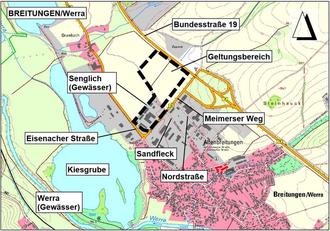 Der Geltungsbereich umfasst in der Gemarkung Breitungen, Flur 0 die Flurstücke 1984/5, 1984/6, 1984/7, 1984/7, 1984/8, 1984/9, 1984/10, 1985/4, 1985/5, 1985/6, 1985/7, 1986/4, 1986/5, 1986/6, 1986/7, 1987/5, 1987/6, 1987/7, 1987/8, 1987/9, 1987/10, 1990/3, 1992/3, 2017/11 (teilweise), 2017/12, 2017/16, 2017/17, 2018/5, 2019 (teilweise), 2756/1, 2756/2, 2757, 2758, 2759, 2760, 2761, 2762, 2763, 2764 (teilweise), 2765, 2766/1, 2766/2, 2767, 2768 und 2770. 1