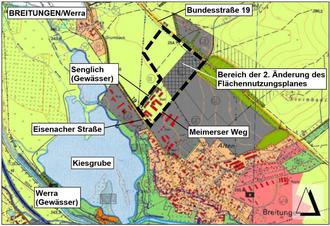 Der Bereich der 2. Änderung des Flächennutzungsplanes liegt im Norden der Gemeinde Breitungen/Werra. Er wird im Wesentlichen von der Bundesstraße 19 im Nordosten, vom „Meimerser Weg“ im Südosten und von der „Eisenacher Straße“ im Südwesten umschlossen. Im Nordwesten wird der Änderungsbereich von landwirtschaftliche Flächen (Fläche für die Landwirtschaft) bzw. vom „Senglich“ (Gewässer) begrenzt.