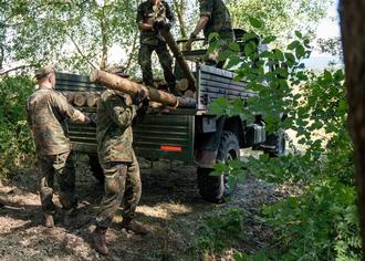 Am Montag wurden dazu alle notwendigen Vorbereitungen und Absprachen zwischen der Kompanie und der Gemeinde getroffen, sodass am Dienstag schließlich mit „schwerem Gerät“ angerückt werden konnte. Unter der Brücke über die Werra in der Amtsstraße wurde teils mit Schlauchbooten, Baggern und Lkw das Flussufer bereinigt. An den zwei weiteren Stationen, die auf die Erneuerung des Knüppeldamms ausgerichtet waren, wurden gekennzeichnete Bäume gefällt, entastet und zum Transport auf das richtige Maß geschnitten. Am Damm selbst wurde schließlich das alte, unbrauchbare Holz entfernt, der Untergrund vorbereitet und mit den neuen Stämmen wiederaufgebaut. Am Donnerstagmorgen konnten die Arbeiten schließlich abgeschlossen werden.