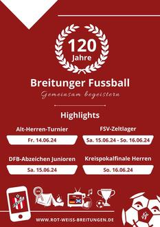 Seit 120 Jahren ist der FSV Rot-Weiß Breitungen ein fester Bestandteil der Fußballgeschichte in Breitungen an der Werra. Die Leidenschaft für den Sport, die Freude am Spiel und die Verbundenheit zur Gemeinschaft haben den FSV zu dem gemacht, was er heute ist - ein moderner Verein, der stolz auf seine Tradition und seine Mitglieder ist. Die stetige Weiterentwicklung ist auch ein Garant für die Zukunft und dort wird der FSV mit Sicherheit seinen Platz finden.