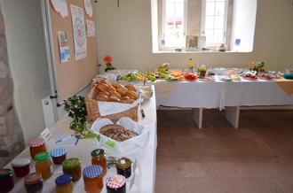 Da neben der Bewegung auch die Ernährung und Entspannung eine wichtige Rolle in einem gesunden Leben spielt, lud die örtliche Arbeitsgruppe zu einem gesunden Gartenfrühstück ein. Ein abwechslungsreiches Buffet, ergänzt mit Marmeladenkreationen der Teilnehmerinnen, war der Rahmen für offene Gesprächsrunden über vorhandene Bewegungsmöglichkeiten im Dorf und was ggf. fehlt, um aktiver werden zu können. Es gab viele interessante Hinweise.