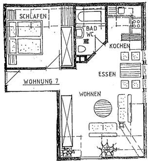 Die Wohnung befindet sich im Dachgeschoss und hat eine Größe von 48 m2. Sie verfügt über zwei Zimmer mit integrierter Küchenzeile) Bad und separatem WC.