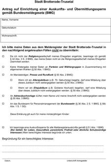 Die Widersprüche gegen Datenübermittlungen bzw. der Antrag auf Einrichtung einer Auskunftssperre, sind ohne Angabe von Gründen (außer bei der Einrichtung einer Auskunftssperre) schriftlich bei der
