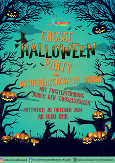 Die Tourismus GmbH Brotterode-Trusetal lädt ein zur Großen Halloweenparty mit Rübenbözschnitzen in der Werkstatt des Grauens und Führungen durch den Gruselstollen, schaurig leckere Snacks, wie Hexensuppe und Monsterkekse.