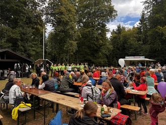 Das Waldfest auf der Brotteroder Reitbahn aber konnte bei wiederum bei gutem Wetter stattfinden. Erstmals gab es auf der Reitbahn eine Taufe. Seniorchef Emmerich Lesser von der gleichnamigen Fleischerei stand an der Feldküche und verteilte Erbsensuppe, Juniorchef Robert Lesser gab die Wiener dazu. Stefan Köllner und ich hatten am Grill alle Hände voll zu tun. Während es am Vormittag noch ordentlich frisch war im Wald, wurde es gegen Mittag zunehmend angenehmer. Zudem kam die Sonne immer mehr hervor. Deshalb ließ es sich im Freien gut aushalten. Hubert Lesser sorgte für den Shuttleverkehr, der sehr gut in Anspruch genommen wurde. Die Rennsteigsänger unterhielten. Kaffee und Kuchen konnte man sich schmecken lassen. Wie immer gab es eine große Pilzausstellung und auch verschiedene Mitmachaktionen für Kinder waren vorbereitet. Insgesamt ein schöner Tag, den der Musikverein Brotterode musikalisch ausgestaltete.