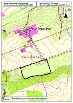 Entsprechend dem Beschluss Nr. 83/2021 des Stadtrates der Stadt Bürgel vom 07.12.2021, wurde die Aufstellung vorgenannten vorhabenbezogenen Bebauungsplanes mit Vorhaben- und Erschließungsplan nach §12 Abs. 2 BauGB zur Schaffung des Baurechts für die Errichtung einer Freiflächen-Photovoltaikanlage eingeleitet. Der Geltungsbereich des Bebauungsplanes umfasst das Flurstück 90/1 der Gemarkung Göritzberg, Flur 1 und ist dem Lageplan gemäß Anlage zu entnehmen. Der Vorentwurf des vorhabenbezogenen Bebauungsplanes mit Vorhaben- und Erschließungsplan und der Begründung wurde gebilligt und der Bürgermeister beauftragt das weitere Aufstellungsverfahren durchzuführen. Hierfür ist es gemäß § 3 Abs. 1 BauGB unter anderem notwendig, eine frühzeitige Öffentlichkeitsbeteiligung durchzuführen, in welcher die Ziele und Zwecke der Planung dargestellt werden.