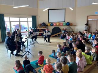 Am 10.01.2024 fand ein Märchenkonzert im Bewegungsraum des Montessori-Kinderhauses statt. Im Vorfeld wurden die Kinder darüber informiert, dass sie Besuch von der Polizei bekommen. Alle Kinder waren sehr aufgeregt und haben die Vorbereitungen im Bewegungsraum eifrig beobachtet. Die Kinder stellten oft die Frage, warum denn die Polizei in unser Kinderhaus kommt. Nachdem sich alle Gruppen des Hauses im Kinderhaus versammelt hatten, sahen sie die 5 Männer und Frauen in Uniform des Polizeiorchester mit ihren Instrumenten. Nach einer kurzen Vorstellung und gemeinsamen Singendes Liedes „Fuchs du hast die Gans gestohlen“ ging es um das Märchenkonzert „Die Bremer Stadtmusikanten“. Das Märchen wurde vorgelesen und mit Instrumenten begleitet. Die musikalische Erfahrung in Zusammenhang mit der Polizei war für viele Kinder neu und zugleich interessant. Sogar die kleinsten des Kinderhauses haben gespannt zugehört und den Klängen der Instrumente gelauscht. Wir möchten uns für diese musikalische Unterhaltung nochmal vielmals beim Polizeiorchester Thüringen bedanken und hoffen nächstes Jahr auf ein Wiedersehen.