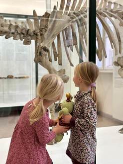 Im Museum angekommen konnten die Kinderaufgeteilt in Kleingruppen mit einer Erzieherin die Räumlichkeiten erkunden. Im Erdgeschoss konnte man in die Einzigartigkeit der Bernsteinwelt eintauchen sowie den Evolutionssaal mit Themen der Evolutionsbiologie entdecken. Individuelle Fragen der Kinder konnten von den Erzieherinnen durch die wenige Anzahl der Kinder (ca. 4 Kinder pro Kleingruppe) beantwortet werden. Nach der Hälfte der Zeit kam auch schon der kleine Hunger. Im Foyer des Phyletischen Museums konnten die Kinder auf einer Bank ein kleines Picknick machen. Warmer Tee/ Kinderpunsch mit Obst wurden von den Erzieherinnen gereicht. Danach ging es weiter in die nächsten Räumlichkeiten. Die Kinder konnten im Obergeschoss vier Ausstellungsräume erkunden mit der stammesgeschichtlichen Entwicklung der Organismen von der Entstehung des Lebens bis zu der heutigen Artenvielfalt.