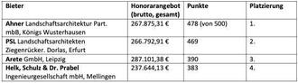 Von allen Bietern wurden im Ergebnis der Vergabeverhandlung bis zum 29.10.24, 10:00 Uhr finale Angebote vorgelegt. Die Bewertung durch die Jury unter Einbeziehung der Angebote führte zu folgenden Ergebnissen: