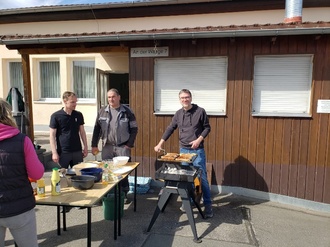 Knut Feine verteilte an die fleißigen Helfer Getränke, während Jan Hildebrandt den Rost vorbereitete am Dorfgemeinschaftshaus für das gemeinsame Mittagessen.