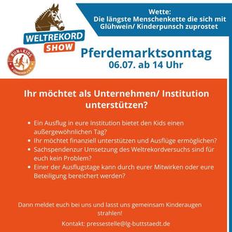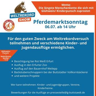Erstmals präsentiert der Thüringer Pferdemarkt einen Weltrekordversuch am Sonntagnachmittag. Gemeinsam mit RUN4Kids soll die längste Menschenkette im Glühweinanstoßen aufgestellt werden. Selbstverständlich gibt es auch Kinderpunsch. Mit einem Einsatz von 5 € bekommen alle Teilnehmer ihren eigenen Weltrekord-Becher samt Getränk. Der Erlös wird für verschiedene gemeinnützige Aktionen eingesetzt.