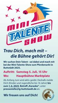 Du hast Lust dein können auf der Pferdemarktbühne zu präsentieren? Dann meld dich zur Samstagnachmittagshow an und erobere die Bühnen dieser Welt!
