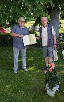 Bernd Hegenberger eröffnete als Vorsitzender unserer Anlage das Gartenfest und begrüßte die Anwesenden. Bürgermeister Hendrik Blose war unserer Einladung gefolgt. Er gratulierte zum Jubiläum und dankte uns Gartenfreunden für das ehrenamtliche Engagement. Hans Jecke als Vizepräsident des Landesverbandes Thüringen der Gartenfreunde e.V. war gekommen, um Glückwünsche zu überbringen. Er erläuterte die Bedeutung des Kleingartenwesens und benannte die Herausforderungen, die speziell hier auf dem Land auf die Vorstände zukommen. Er dankte den Vorstandsmitgliedern für die ehrenamtliche Arbeit. Dann überreichte er eine Ehrenurkunde und einen Zinnschmuckteller zur Erinnerung an das Vereinsjubiläum. Danach übernahm er die Ehrung von verdienten Vereinsmitgliedern. Bernd Hegenberger, Hans von Darsen und Birgit Verwiebe wurden mit der Ehrennadel in Bronze ausgezeichnet. Weitere geschätzte Mitglieder wurden mit Ehrenurkunden bedacht: Gisela Bender, Britta Erdmann, Sieglinde Wieck, Gerald Albrecht, Käte Beck, Dieter Sander, Elke und Dietmar Schreiber (die drei Letztgenannten waren leider nicht persönlich anwesend). Besonders freuten wir uns über unsere Vorstandskollegen der anderen Buttstädter Gartenanlagen, die uns ebenfalls herzlichst gratulierten. Herbert Seidler überreichte uns einen Rosenstock und einen Gutschein als Geschenk von der Anlage „Wiesengrund“. Darüber freuten wir uns sehr. Anschließend trug Frau Körner, ehemaliges sehr aktives Mitglied in unserem Verein, noch ein selbst geschriebenes Gedicht vor, welches viel Beifall bekam. Dann ging es zum gemütlichen Teil des Festes über. Es warteten Köstlichkeiten vom Rost, Fettbrot, Pommes und gemixte Getränke auf die Gäste. An diesem wunderschönen Sommerabend wurde noch viel geschwatzt über die alten und die neuen Zeiten.