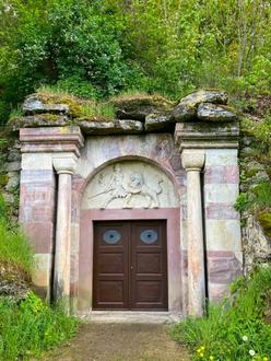 Das Löwenkämpferportal zum Beispiel: Es ist das Mundloch eines blinden Stollens, auf dem gängigen Parkplan gar nicht verzeichnet, aber leicht zu finden. Man muss nur an der Rückseite des Römischen Hauses ein paar Stufen hinabsteigen und ein kleines Stück dem Kiesweg folgen. Da schmiegt sich die säulengeschmückte Doppeltür in den moosbewachsenen Fels; auf dem Relief ringt Herakles mit dem Löwen. Ein dekoratives Element; gestaltet hat es kein Geringerer als Clemens Wenzeslaus Coudray, Goethes Mitstreiter und Freund, der als Oberbaudirektor des Großherzogtums Weimar-Sachsen-Eisenach das klassizistische Weimar geprägt hat.