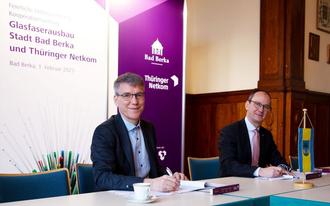 Im Stadtgebiet Bad Berka und in den Ortsteilen soll bis Februar 2026 ein Glasfasernetz mit Direktanschlüssen bis in Wohn- und Geschäftsgebäude gebaut werden. Das sieht die Kooperationsvereinbarung vor, die am 01.02.2023 im Ratssaal des Rathauses Bad Berka von dem Geschäftsführer der Thüringer Netkom, Herrn Karsten Kluge, und von mir unterzeichnet wurde. Die Thüringer Netkom hat bereits vor Jahren den DSL-Ausbau in Bad Berka umgesetzt, allerdings seinerzeit nur bis zu den örtlichen Verteilkästen. Nun gilt es, das Glasfasernetz zu verlängern und den tatsächlichen Hausanschluss für jedes Gebäude zu schaffen.