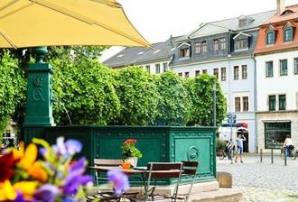 Heute haben Gastwirte rund um den Brunnen Stühle und Sonnenschirme aufgestellt. Pflastermüde Gäste finden Platz zum Ausruhen, unternehmungslustige den idealen Startpunkt für einen Spaziergang auf Coudrays Spuren. Das Torhaus am Frauenplan, der Westflügel des Schlosses, die Fürstengruft, ein zweiter, ähnlicher Brunnen am Herderplatz - alles sein klassizistisches Werk.
