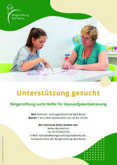 Steigender Bedarf besteht in der Unterstützung der Kinder im Familien- und Jugendzentrum bei der Erledigung ihrer Schulaufgaben. Die Bürgerstiftung Bad Berka wurde darauf aufmerksam und setzt sich nun aktiv dafür ein, Hausaufgabenbetreuer zu finden. Kinder im Alter zwischen 8 bis 15 Jahren sollen künftig bei der Erledigung ihrer Hausaufgaben unterstützt werden. Die Hilfe ist kostenlos für die Kinder.