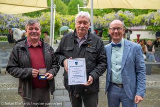 Die Ehrenmedaille der Stadt Bad Berka erhielt im Rahmen des Jahresempfangs des Bürgermeisters in diesem Jahr Siegfried Fürst (Mitte), langjähriger Ortsteilbürgermeister von Schoppendorf. Die Laudatio hielt Ortschronist Gerald Weiß (links). Bürgermeister Michael Jahn (rechts).