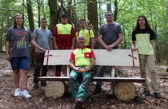 Herr Zimmer, Bauhofleiter von Bad Berka (2. v. r.), nimmt in Vertretung für Bürgermeister Michael Jahn die neue Ruhebank an der Reinhardsquelle entgegen. Unterstützt durch den Thüringer Forst haben die Schüler Tim Thiemann und Ben Chelkowksi der Freien Ganztagsschule Milda das Projekt umgesetzt.