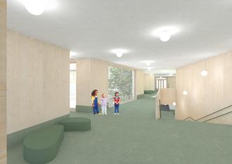 Der neue Kindergarten wird zukünftig nicht nur als modernes Gebäude überzeugen, sondern auch durch eine innovative Architektur. Auf zwei Etagen wird der Kindergarten errichtet, wobei die untere Etage geschickt in das natürliche Hanggelände des Parks integriert wird. Die Architektur setzt zum großen Teil auf eine Holzbauweise, die nicht nur ästhetisch ansprechend, sondern auch besonders nachhaltig ist und eine warme, einladende Atmosphäre für die Kinder schafft. Der großzügige Einsatz von Holz verbindet das Gebäude auf harmonische Weise mit seiner grünen Umgebung und fördert gleichzeitig ein gesundes Raumklima. Bei der Planung wurde auch besonderer Wert auf die Integration von Menschen mit körperlichen Einschränkungen gelegt. Es wurde darauf geachtet, dass sowohl Kinder als auch Erzieher, unabhängig von ihren individuellen Bedürfnissen, sich in der Einrichtung wohlfühlen können. Alle Bereiche sind barrierefrei gestaltet, sodass sowohl Rollstuhlfahrer als auch Menschen mit anderen Mobilitätseinschränkungen problemlos Zugang haben und aktiv am Alltag teilnehmen können.