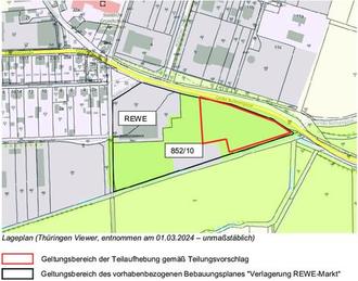Der Stadtrat der Stadt Blankenhain hat in öffentlicher Sitzung am 25.04.2024 den Entwurf der Teilaufhebung des vorhabenbezogenen Bebauungsplanes "Verlagerung REWE-Markt" gebilligt und beschlossen, diesen nach § 3 Abs. 2 BauGB zu veröffentlichen. Für den Planbereich ist der Entwurf vom März 2024 maßgebend.