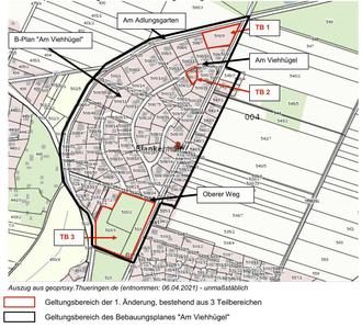 Übersichtsplan 1. Änderung BP Nr. 4 "Am Viehhügel" - Lage der einzelnen Teilbereiche