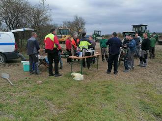 Die Vorbereitungsarbeiten wurden bis zum 30. Oktober abgeschlossen und der Feiertag am 31. Oktober sollte dafür genutzt werden mit vorhandenen Feldsteinen die größten Löcher zu verfüllen. Über 70 freiwillige Helfer aus allen sechs Ortsteilen sind der Einladung gefolgt und so konnten mehrere 100 t Feldsteine in die Löcher eingebracht und festgewalzt werden.